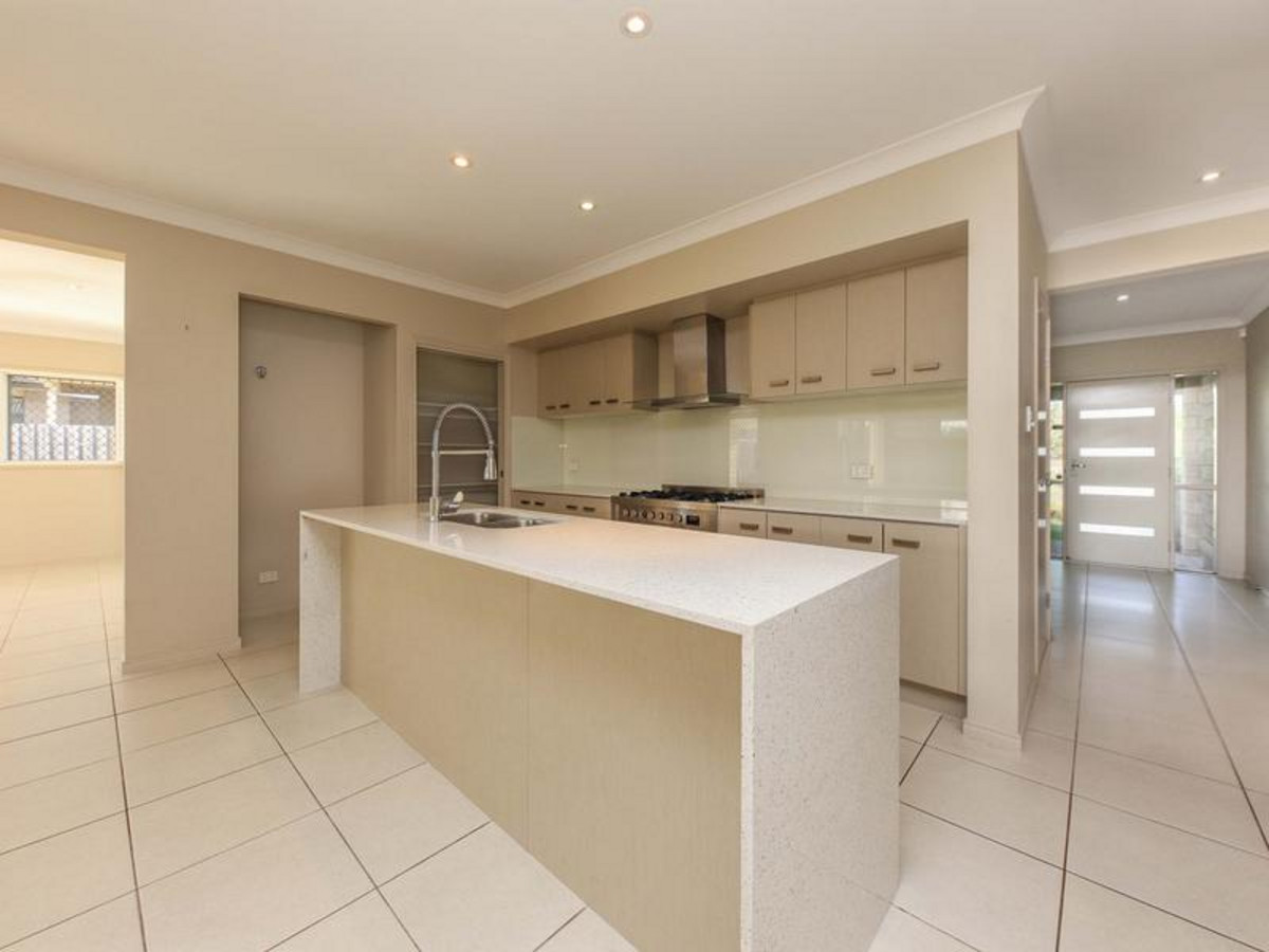 In the kitchen you’ll find gorgeous modern style complimented by; a 5-burner gas stove, detachable tap, dishwasher and a large walk in pantry. As you continue from the kitchen you’ll notice the large open tiled lounge room with multiple ceiling fans and an air-conditioner for the hot summer months, along with the dining room close by.